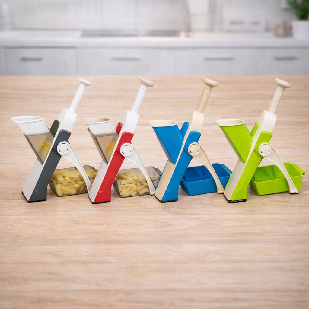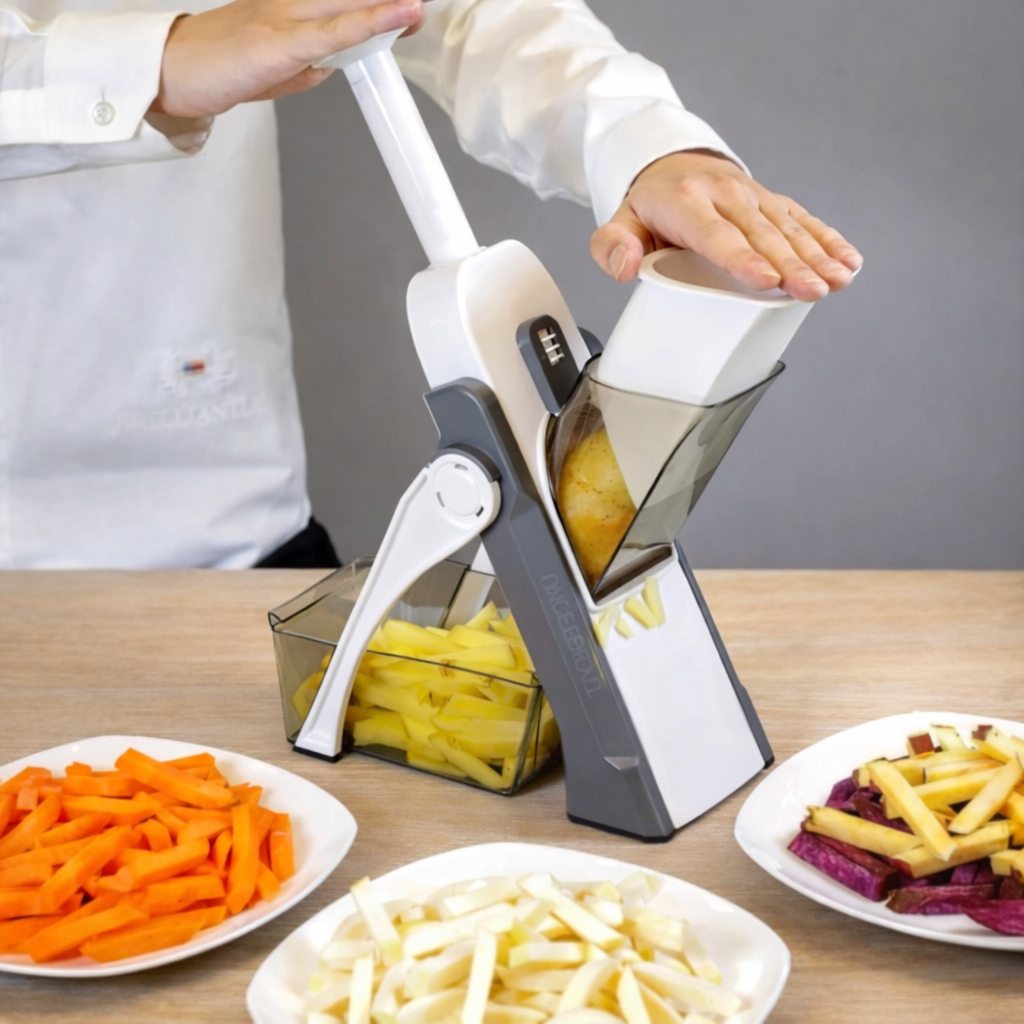 CARACTERÍSTICAS PRINCIPAIS: - 5 funções distintas e 6 tipos de cortes: Versatilidade para cortar em fatias, tiras, julienne e cubos, com espessura ajustável de 0,5 a 8 mm; - Lâminas intercambiáveis de aço inoxidável 420: Afiadas, duráveis e resistentes à corrosão, garantem cortes precisos e duradouros; - Base com ventosas emborrachadas: Proporciona maior estabilidade durante o uso, prevenindo deslizamentos para garantir sua segurança; - Design compacto e portátil: Equipado com alça retrátil e suporte dobrável, permitindo fácil armazenamento em gavetas comuns;